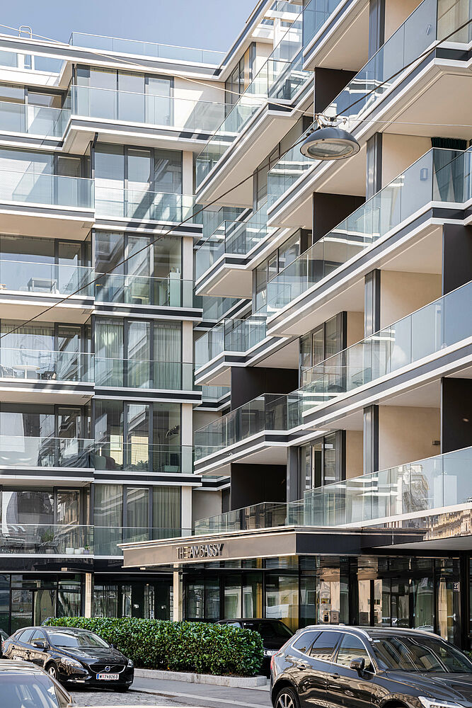 Les appartements sont équipés de matériaux nobles et de qualité supérieure et offrent une ambiance stylée et mondaine. L'architecture exceptionnelle avec sa façade ouverte, ses grandes surfaces vitrées avec des fenêtres à hauteur de plafond ainsi que ses loggias, balcons et terrasses complètent le tableau et font de The Ambassy un bâtiment phare de Vienne.