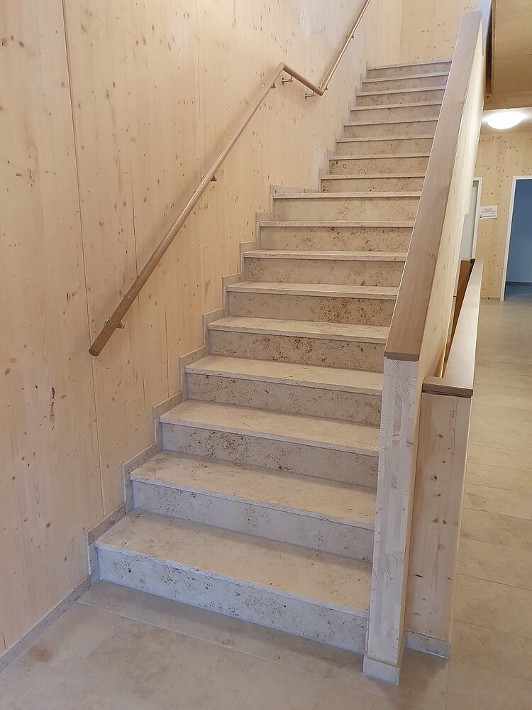 Au cœur de la commune voisine d'Amberg, Kümmersbruck, un complexe résidentiel pour seniors comprenant 26 unités d'habitation ainsi qu'un centre de services avec une pharmacie et des soins médicaux a été construit juste à côté de la mairie. Le projet, baptisé Herbstwiesen Kümmersbruck, a été construit en ossature bois légère, respectueuse des ressources. Les surfaces en bois clair, notamment dans la cage d'escalier et dans les couloirs communs, créent une atmosphère de bien-être naturel.